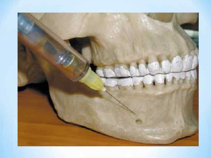 при ментальной анестезии - подбородочное отверстие. Оно находится на уровне середины альвеолы второго премоляра или на уровне межальвеолярной перегородки, между первым и вторым нижними премолярами и на 12 -13 мм выше нижнего края нижней челюсти