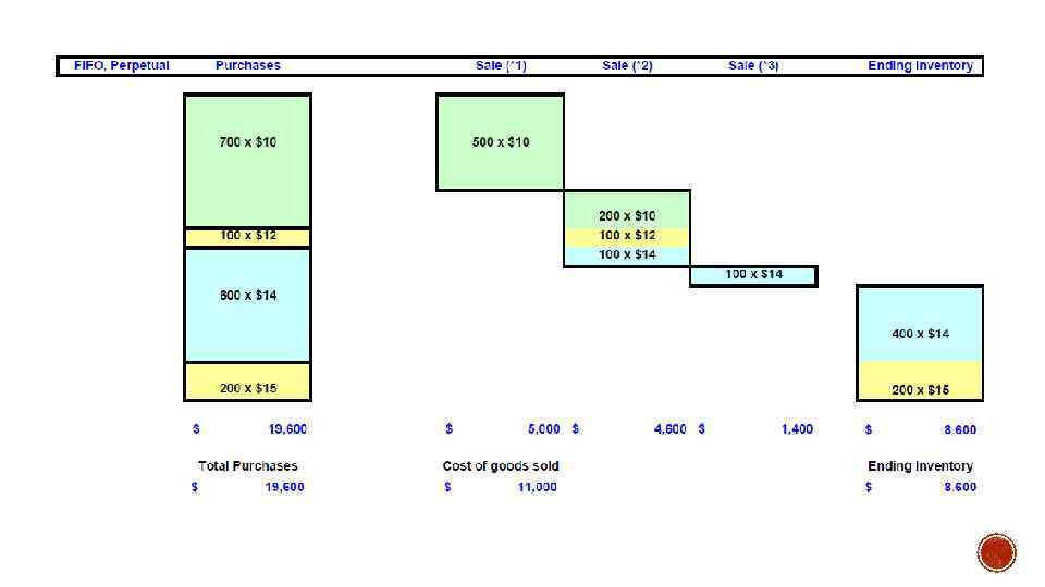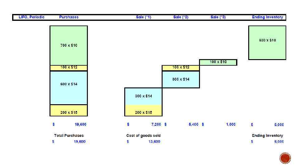 Comparison FIFO LIFO Purchase Perpetual Periodic $ $ When prices go up 19, 600 Old cost < Recent cost Cost of goods sold Ending inventory FIFO Old cost Recent cost < > LIFO Recent cost Old cost Perpetual Cost of goods sold Ending inventory $ $ FIFO 11, 000 8, 600 < > LIFO $ 12, 400 $ 7, 200 Periodic Cost of goods sold Ending inventory $ $ FIFO 11, 000 8, 600 < > LIFO $ 13, 600 $ 6, 000 FIFO Cost of goods sold Ending inventory Perpetual $ 11, 000 $ 8, 600 = = Periodic $ 11, 000 $ 8, 600 LIFO Cost of goods sold Ending inventory Perpetual $ 12, 400 $ 7, 200 < > Periodic $ 13, 600 $ 6, 000 LIFO Cost of goods sold Ending inventory Perpetual Old cost Recent cost < > Periodic Recent cost Old cost LIFO perpetual applies "Last-in First-out" during the period. LIFO periodic applies "Last-in First-out" at the end of period. Cost of goods sold Ending inventory $ $ $ $ 11, 000 12, 400 11, 000 13, 600 8, 600 7, 200 8, 600 6, 000