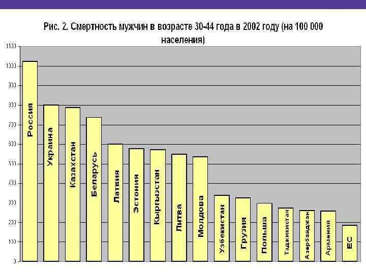 Смертность от сердечно -сосудистых заболеваний в некоторых европейских странах Страна Смертность от ССЗ на 100 тыс. населения Франция 118, 0 Дания 182, 0 Андорра 125, 0 Финляндия 201, 0 Испания 137, 0 Австрия 204, 0 Швейцария 142, 0 Португалия 208, 0 Бельгия 162, 0 Германия 211, 0 Исландия 164, 0 Ирландия 214, 0 Нидерланды 171, 0 ………………………………. Италия 174, 0 Молдова 619, 0 Швеция 176, 0 Украина 637, 0 Норвегия 181, 0 Россия 688, 0