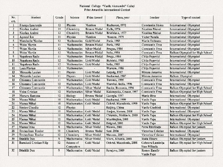 THE INTERCOUNTY MATHEMATICS “CRISTIAN S. CALUDE” n This competition is organized every year, in October and/or November, by the department of mathematics at “Vasile Alecsandri” National College, in cooperation with the County School Inspectorate of Galaţi and the Galaţi branch of the Romanian Society of Mathematical Sciences. n The contest is aimed towards the elites of Romanian mathematics, is being held under the patronage of teacher Cristian S. Calude, a former student at “ Vasile Alecsandri ” National College in Galaţi, at present teaching at the Auckland University, New Zealand, and a worldwideknown personality, and represents a way of stimulating students to prepare for great results, both nationally and internationally.