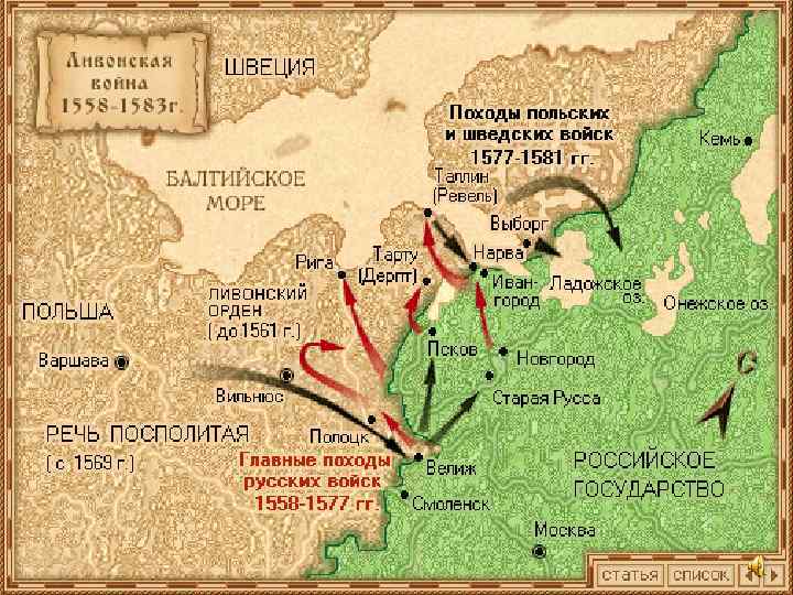1561 -1578 годы. Война с Литвой, Данией и Швецией. • В 1563 году русские войска вошли в Полоцк, но в начале следующего года потерпели крупное поражение в сражении с литовцами. • В 1577 году русские войска заняли ряд прибалтийских крепостей. • 1578 год ряд тяжелых поражений.