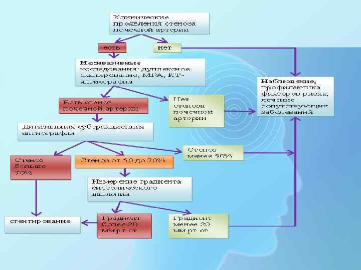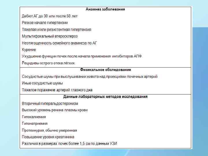 Вероятность вазоренальной гипертензии Клинические симптомы Дополнительные исследования Низкая - <1% Стабильная доброкачественная артериальная гипертензия I-II ст. ("мягкая – умеренная) при диастолическом АД <110 мм рт. ст Не требуются Средняя – 5 -15% • Артериальная гипертензия, рефрактерная к многокомпонентной медикаментозной терапии; • Внезапное появление артериальной гипертензия II -III ст. у лиц моложе 20 и старше 45 лет; • Артериальная гипертензия II ст. с диастолическим АД >100 у курящих, а также при наличии атеросклероза других сосудистых бассейнов Неинвазивные скрининговые исследования: УЗДГ (коронарных, брахиоцефальных, артерий нижних почечных артерий, РРГ или сцинтиграфия почек конечностей, аневризмах брюшной аорты); • Стойкое повышение уровня креатинина плазмы при артериальной гипертензии II ст. ; • Эффективность ингибиторов АПФ у лиц с впервые выявленной артериальной гипертензии IIIII ст. Высокая - >25% • Артериальная гипертензия III ст. , рефрактерная к медикаментозной терапии, с нарастающей почечной недостаточностью, особенно у курящих и при атеросклерозе в других сосудистых бассейнах; • Резкое утяжеление течения ранее стабильной артериальной гипертензии; Срочно. • Быстропрогрессирующая и злокачественная артериальная гипертензия с поражением органов – Неинвазивные скрининговые методы и мишеней; ангиография. • Резкое повышение уровня креатинина плазмы и другие признаки хронической почечной недостаточности у лиц с артериальной гипертензии, особенно на фоне приема ингибиторов АПФ; • Уменьшение размеров одной из почек у лиц с артериальной гипертензией.