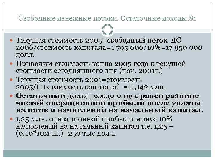 Свободные денежные потоки. Остаточные доходы. 81 Текущая стоимость 2005=свободный поток ДС 2006/стоимость капитала=1 795 000/10%=17 950 000 долл. Приводим стоимость конца 2005 года к текущей стоимости сегодняшнего дня (нач. 2001 г. ) Текущая стоимость 2001=стоимость 2005/(1+стоимость капитала) =11, 142 млн. Остаточный доход каждого года равен разнице чистой операционной прибыли после уплаты налогов и начислений на начальный капитал. 1, 25 млн. операционной прибыли минус 10% начислений на начальный капитал т. е. 1, 25 – (0, 10*10 млн. )=250 тыс. долл.