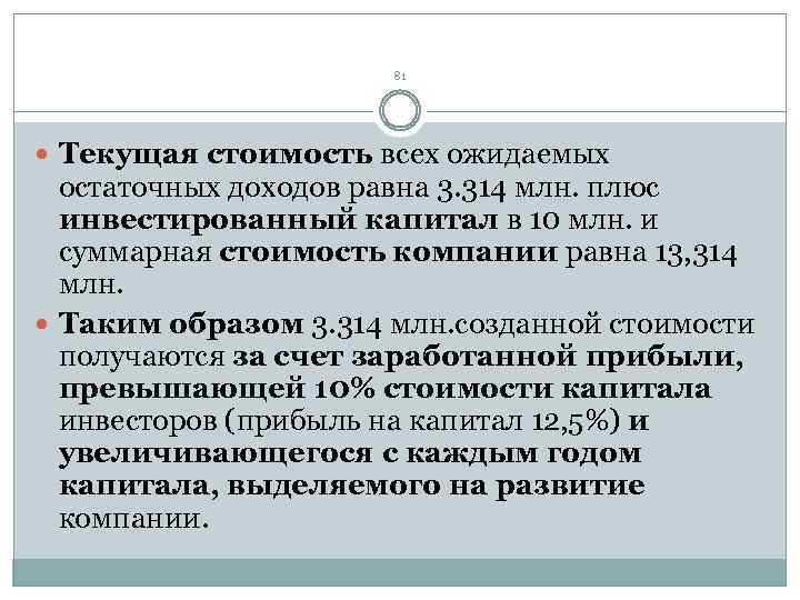 81 Текущая стоимость всех ожидаемых остаточных доходов равна 3. 314 млн. плюс инвестированный капитал в 10 млн. и суммарная стоимость компании равна 13, 314 млн. Таким образом 3. 314 млн. созданной стоимости получаются за счет заработанной прибыли, превышающей 10% стоимости капитала инвесторов (прибыль на капитал 12, 5%) и увеличивающегося с каждым годом капитала, выделяемого на развитие компании.