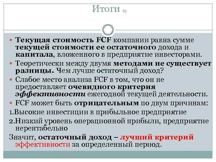 Итоги 83 Текущая стоимость FCF компании равна сумме текущей стоимости ее остаточного дохода и капитала, вложенного в предприятие инвесторами. Теоретически между двумя методами не существует разницы. Чем лучше остаточный доход? Слабое место анализа FCF в том, что он не предоставляет очевидного критерия эффективности ежегодной текущей деятельности. FCF может быть отрицательным по двум причинам: 1. Высокие инвестиции в прибыльное предприятие 2. Низкий уровень операционной прибыли, предприятие нерентабельно Значит, остаточный доход – лучший критерий эффективности за определенный период.