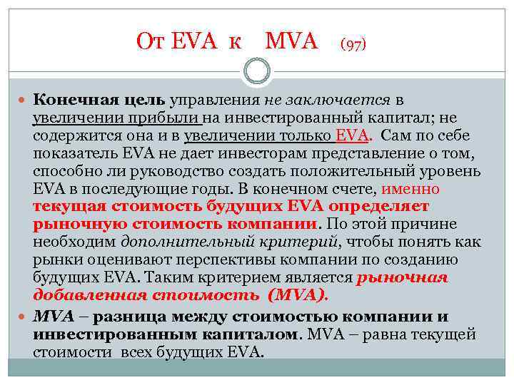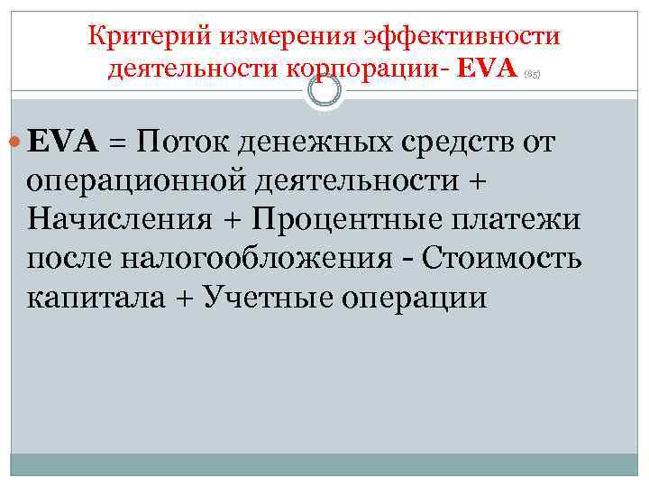 Критерий измерения эффективности деятельности корпорации- EVA (85) EVA = Поток денежных средств от операционной деятельности + Начисления + Процентные платежи после налогообложения - Стоимость капитала + Учетные операции