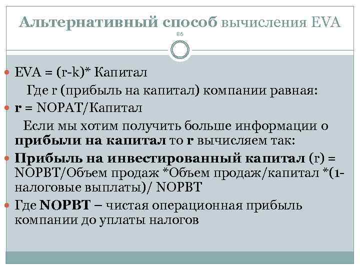 Альтернативный способ вычисления EVA 86 EVA = (r-k)* Капитал Где r (прибыль на капитал) компании равная: r = NOPAT/Капитал Если мы хотим получить больше информации о прибыли на капитал то r вычисляем так: Прибыль на инвестированный капитал (r) = NOPBT/Объем продаж *Объем продаж/капитал *(1 налоговые выплаты)/ NOPBT Где NOPBT – чистая операционная прибыль компании до уплаты налогов