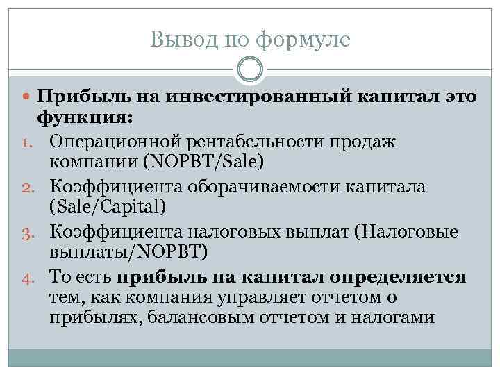 Вывод по формуле Прибыль на инвестированный капитал это функция: 1. Операционной рентабельности продаж компании (NOPBT/Sale) 2. Коэффициента оборачиваемости капитала (Sale/Capital) 3. Коэффициента налоговых выплат (Налоговые выплаты/NOPBT) 4. То есть прибыль на капитал определяется тем, как компания управляет отчетом о прибылях, балансовым отчетом и налогами