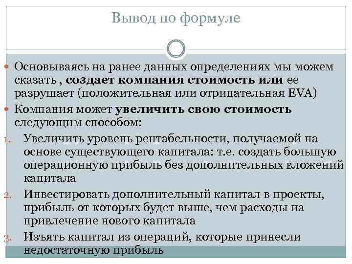 Вывод по формуле Основываясь на ранее данных определениях мы можем сказать , создает компания стоимость или ее разрушает (положительная или отрицательная EVA) Компания может увеличить свою стоимость следующим способом: 1. Увеличить уровень рентабельности, получаемой на основе существующего капитала: т. е. создать большую операционную прибыль без дополнительных вложений капитала 2. Инвестировать дополнительный капитал в проекты, прибыль от которых будет выше, чем расходы на привлечение нового капитала 3. Изъять капитал из операций, которые принесли недостаточную прибыль