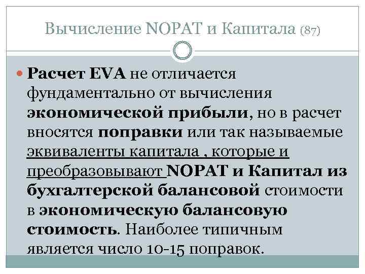Вычисление NOPAT и Капитала (87) Расчет EVA не отличается фундаментально от вычисления экономической прибыли, но в расчет вносятся поправки или так называемые эквиваленты капитала , которые и преобразовывают NOPAT и Капитал из бухгалтерской балансовой стоимости в экономическую балансовую стоимость. Наиболее типичным является число 10 -15 поправок.