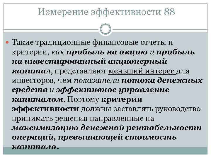 Измерение эффективности 88 Такие традиционные финансовые отчеты и критерии, как прибыль на акцию и прибыль на инвестированный акционерный капитал, представляют меньший интерес для инвесторов, чем показатели потока денежных средств и эффективное управление капиталом. Поэтому критерии эффективности должны заставлять руководство принимать решения направленные на максимизацию денежной рентабельности операций, превышающей стоимость капитала.