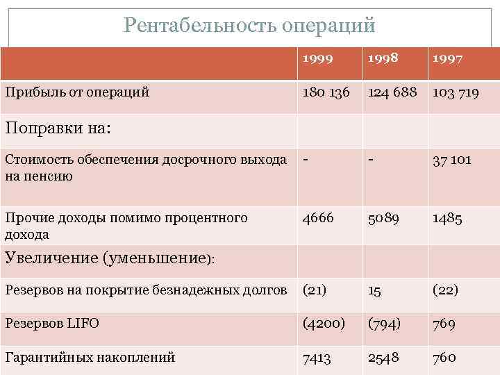 Рентабельность операций 1999 1998 1997 180 136 124 688 103 719 Стоимость обеспечения досрочного выхода на пенсию - - 37 101 Прочие доходы помимо процентного дохода 4666 5089 1485 Резервов на покрытие безнадежных долгов (21) 15 (22) Резервов LIFO (4200) (794) 769 Гарантийных накоплений 7413 2548 760 Прибыль от операций Поправки на: Увеличение (уменьшение):