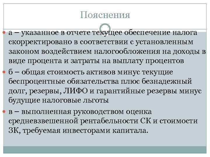 Пояснения а – указанное в отчете текущее обеспечение налога скорректировано в соответствии с установленным законом воздействием налогообложения на доходы в виде процента и затраты на выплату процентов б – общая стоимость активов минус текущие беспроцентные обязательства плюс безнадежный долг, резервы, ЛИФО и гарантийные резервы минус будущие налоговые льготы в – выполненная руководством оценка средневзвешенной рентабельности СК и стоимости ЗК, требуемая инвесторами капитала.