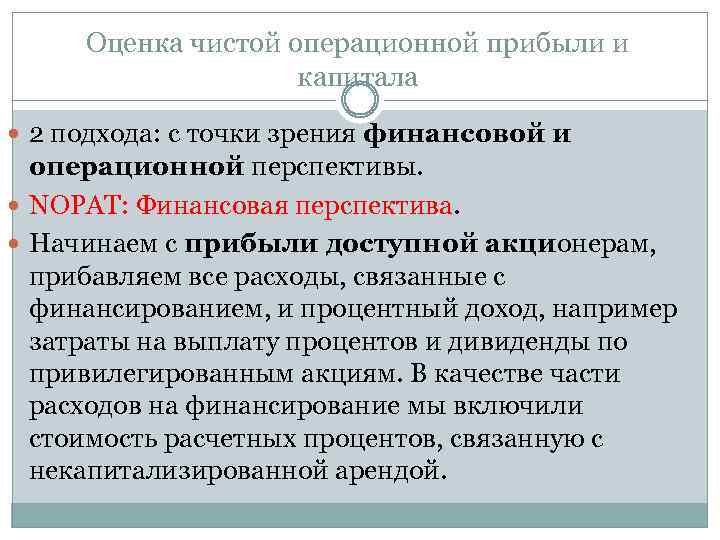 Оценка чистой операционной прибыли и капитала 2 подхода: с точки зрения финансовой и операционной перспективы. NOPAT: Финансовая перспектива. Начинаем с прибыли доступной акционерам, прибавляем все расходы, связанные с финансированием, и процентный доход, например затраты на выплату процентов и дивиденды по привилегированным акциям. В качестве части расходов на финансирование мы включили стоимость расчетных процентов, связанную с некапитализированной арендой.