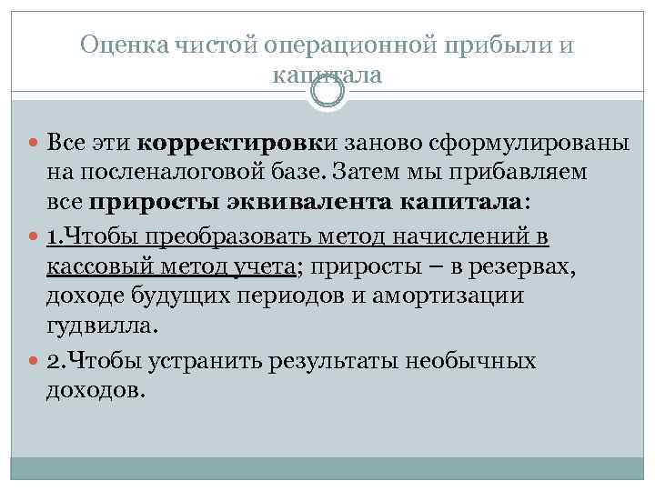 Оценка чистой операционной прибыли и капитала Все эти корректировки заново сформулированы на посленалоговой базе. Затем мы прибавляем все приросты эквивалента капитала: 1. Чтобы преобразовать метод начислений в кассовый метод учета; приросты – в резервах, доходе будущих периодов и амортизации гудвилла. 2. Чтобы устранить результаты необычных доходов.