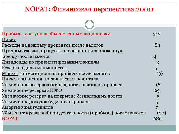 NOPAT: Финансовая перспектива 2001 г Прибыль, доступная обыкновенным акционерам Плюс: Расходы на выплату процентов после налогов Предполагаемые проценты на некапитализированную аренду после налогов Дивиденды по привилегированным акциям Резерв на долю меньшинства Минус: Инвестиционная прибыль после налогов Плюс: Изменения в эквивалентах капитала Увеличение резервов отсроченного налога на прибыль Увеличение резерва ЛИФО Увеличение резерва на покрытие безнадежных долгов Увеличение доходов будущих периодов Амортизация гудвилла Убытки от чрезвычайной деятельности (прибыль) после налогов NOPAT 547 89 14 3 5 (3) 16 25 5 5 7 (26) 686
