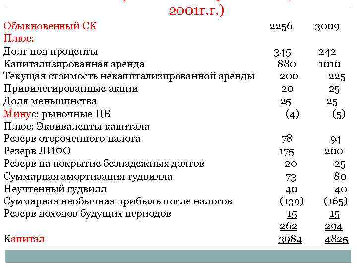 2001 г. г. ) Обыкновенный СК Плюс: Долг под проценты Капитализированная аренда Текущая стоимость некапитализированной аренды Привилегированные акции Доля меньшинства Минус: рыночные ЦБ Плюс: Эквиваленты капитала Резерв отсроченного налога Резерв ЛИФО Резерв на покрытие безнадежных долгов Суммарная амортизация гудвилла Неучтенный гудвилл Суммарная необычная прибыль после налогов Резерв доходов будущих периодов Капитал 2256 345 880 20 25 (4) 78 175 20 73 40 (139) 15 262 3984 3009 242 1010 225 25 25 (5) 94 200 25 80 40 (165) 15 294 4825