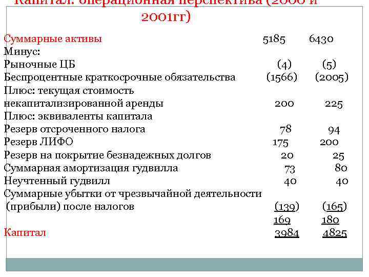 Капитал: операционная перспектива (2000 и 2001 гг) Суммарные активы 5185 6430 Минус: Рыночные ЦБ (4) (5) Беспроцентные краткосрочные обязательства (1566) (2005) Плюс: текущая стоимость некапитализированной аренды 200 225 Плюс: эквиваленты капитала Резерв отсроченного налога 78 94 Резерв ЛИФО 175 200 Резерв на покрытие безнадежных долгов 20 25 Суммарная амортизация гудвилла 73 80 Неучтенный гудвилл 40 40 Суммарные убытки от чрезвычайной деятельности (прибыли) после налогов (139) (165) 169 180 Капитал 3984 4825