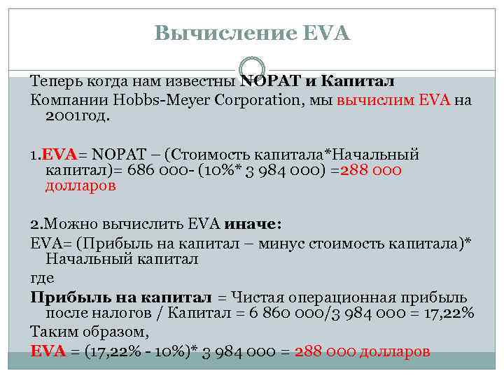 Вычисление EVA Теперь когда нам известны NOPAT и Капитал Компании Hobbs-Meyer Corporation, мы вычислим EVA на 2001 год. 1. EVA= NOPAT – (Стоимость капитала*Начальный капитал)= 686 000 - (10%* 3 984 000) =288 000 долларов 2. Можно вычислить EVA иначе: EVA= (Прибыль на капитал – минус стоимость капитала)* Начальный капитал где Прибыль на капитал = Чистая операционная прибыль после налогов / Капитал = 6 860 000/3 984 000 = 17, 22% Таким образом, EVA = (17, 22% - 10%)* 3 984 000 = 288 000 долларов
