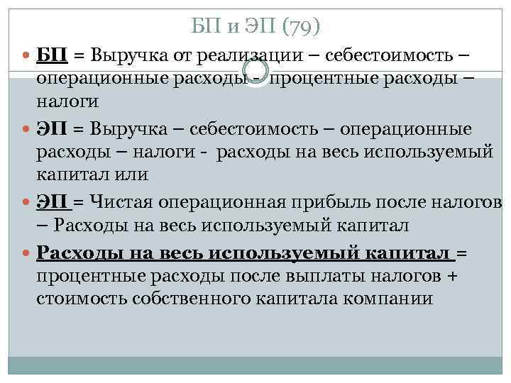 БП и ЭП (79) БП = Выручка от реализации – себестоимость – операционные расходы - процентные расходы – налоги ЭП = Выручка – себестоимость – операционные расходы – налоги - расходы на весь используемый капитал или ЭП = Чистая операционная прибыль после налогов – Расходы на весь используемый капитал = процентные расходы после выплаты налогов + стоимость собственного капитала компании