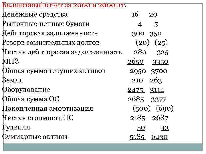 Балансовый отчет за 2000 и 20001 гг. Денежные средства 16 20 Рыночные ценные бумаги 4 5 Дебиторская задолженность 300 350 Резерв сомнительных долгов (20) (25) Чистая дебиторская задолженность 280 325 МПЗ 2650 3350 Общая сумма текущих активов 2950 3700 Земля 210 263 Оборудование 2475 3114 Общая сумма ОС 2685 3377 Накопленная амортизация (500) (690) Чистая стоимость ОС 2185 2687 Гудвилл 50 43 Суммарные активы 5185 6430