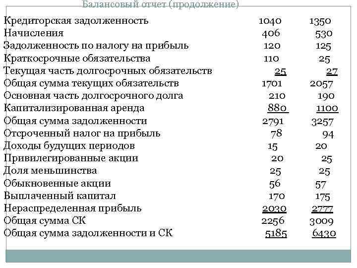 Балансовый отчет (продолжение) Кредиторская задолженность Начисления Задолженность по налогу на прибыль Краткосрочные обязательства Текущая часть долгосрочных обязательств Общая сумма текущих обязательств Основная часть долгосрочного долга Капитализированная аренда Общая сумма задолженности Отсроченный налог на прибыль Доходы будущих периодов Привилегированные акции Доля меньшинства Обыкновенные акции Выплаченный капитал Нераспределенная прибыль Общая сумма СК Общая сумма задолженности и СК 1040 406 120 110 25 1701 210 880 2791 78 15 20 25 56 170 2030 2256 5185 1350 530 125 25 27 2057 190 1100 3257 94 20 25 25 57 175 2777 3009 6430