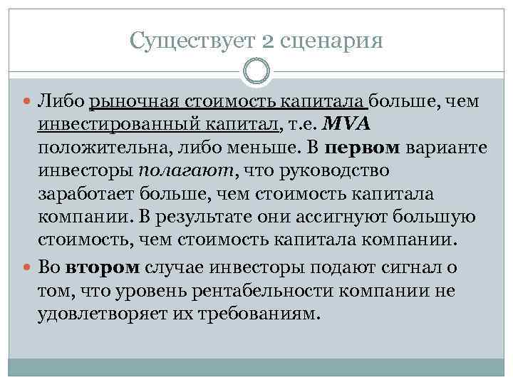 Существует 2 сценария Либо рыночная стоимость капитала больше, чем инвестированный капитал, т. е. MVA положительна, либо меньше. В первом варианте инвесторы полагают, что руководство заработает больше, чем стоимость капитала компании. В результате они ассигнуют большую стоимость, чем стоимость капитала компании. Во втором случае инвесторы подают сигнал о том, что уровень рентабельности компании не удовлетворяет их требованиям.