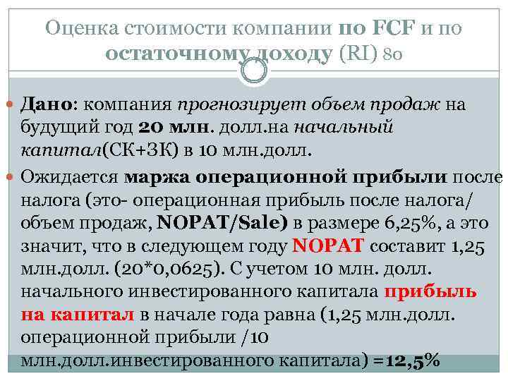 Оценка стоимости компании по FCF и по остаточному доходу (RI) 80 Дано: компания прогнозирует объем продаж на будущий год 20 млн. долл. на начальный капитал(СК+ЗК) в 10 млн. долл. Ожидается маржа операционной прибыли после налога (это- операционная прибыль после налога/ объем продаж, NOPAT/Sale) в размере 6, 25%, а это значит, что в следующем году NOPAT составит 1, 25 млн. долл. (20*0, 0625). С учетом 10 млн. долл. начального инвестированного капитала прибыль на капитал в начале года равна (1, 25 млн. долл. операционной прибыли /10 млн. долл. инвестированного капитала) =12, 5%