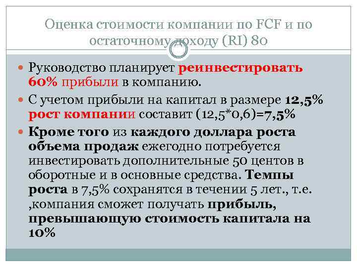 Оценка стоимости компании по FCF и по остаточному доходу (RI) 80 Руководство планирует реинвестировать 60% прибыли в компанию. С учетом прибыли на капитал в размере 12, 5% рост компании составит (12, 5*0, 6)=7, 5% Кроме того из каждого доллара роста объема продаж ежегодно потребуется инвестировать дополнительные 50 центов в оборотные и в основные средства. Темпы роста в 7, 5% сохранятся в течении 5 лет. , т. е. , компания сможет получать прибыль, превышающую стоимость капитала на 10%