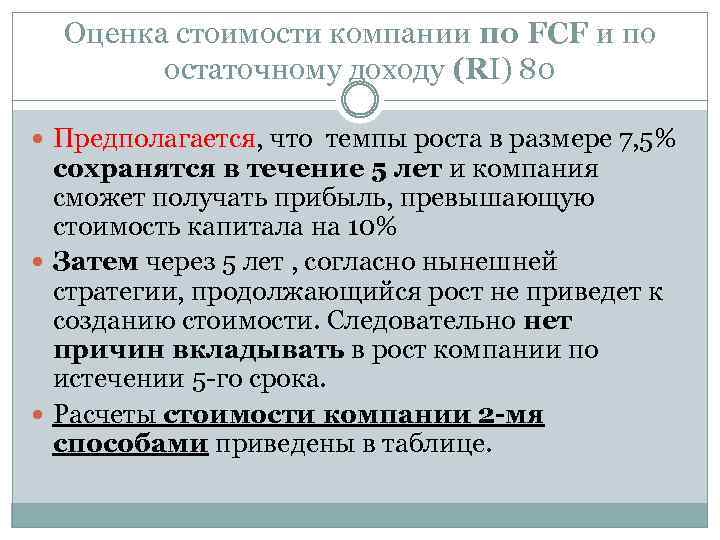 Оценка стоимости компании по FCF и по остаточному доходу (RI) 80 Предполагается, что темпы роста в размере 7, 5% сохранятся в течение 5 лет и компания сможет получать прибыль, превышающую стоимость капитала на 10% Затем через 5 лет , согласно нынешней стратегии, продолжающийся рост не приведет к созданию стоимости. Следовательно нет причин вкладывать в рост компании по истечении 5 -го срока. Расчеты стоимости компании 2 -мя способами приведены в таблице.