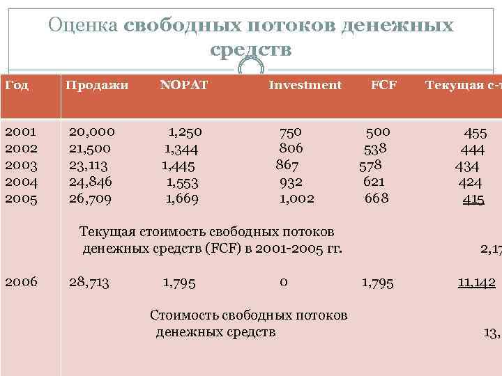 Оценка свободных потоков денежных средств Год Продажи NOPAT 2001 2002 2003 2004 2005 20, 000 21, 500 23, 113 24, 846 26, 709 1, 250 1, 344 1, 445 1, 553 1, 669 Investment 750 806 867 932 1, 002 FCF 500 538 578 621 668 Текущая стоимость свободных потоков денежных средств (FCF) в 2001 -2005 гг. 2006 28, 713 1, 795 0 Стоимость свободных потоков денежных средств Текущая с-т 455 444 434 424 415 2, 17 1, 795 11, 142 13, 3