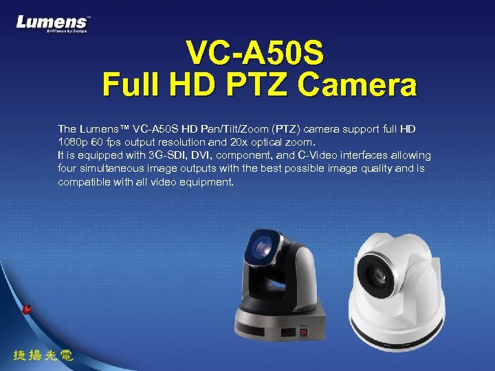 VC-A 50 S Full HD PTZ Camera The Lumens™ VC-A 50 S HD Pan/Tilt/Zoom (PTZ) camera support full HD 1080 p 60 fps output resolution and 20 x optical zoom. It is equipped with 3 G-SDI, DVI, component, and C-Video interfaces allowing four simultaneous image outputs with the best possible image quality and is compatible with all video equipment.