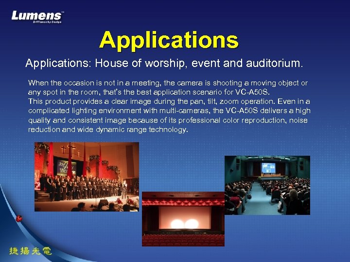 Applications: House of worship, event and auditorium. When the occasion is not in a meeting, the camera is shooting a moving object or any spot in the room, that’s the best application scenario for VC-A 50 S. This product provides a clear image during the pan, tilt, zoom operation. Even in a complicated lighting environment with multi-cameras, the VC-A 50 S delivers a high quality and consistent image because of its professional color reproduction, noise reduction and wide dynamic range technology.