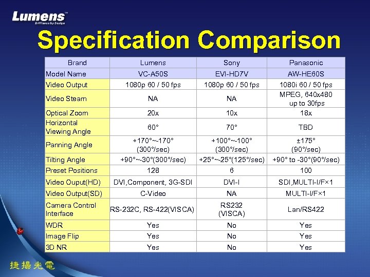 Specification Comparison Brand Lumens Sony Panasonic Model Name VC-A 50 S EVI-HD 7 V AW-HE 60 S Video Output 1080 p 60 / 50 fps Video Steam NA NA Optical Zoom Horizontal Viewing Angle 20 x 1080 i 60 / 50 fps MPEG, 640 x 480 up to 30 fps 18 x 60° 70° TBD +170°~-170° (300°/sec) +90°~-30°(300°/sec) +100°~-100° (300°/sec) +25°~-25°(125°/sec) ± 175° (90°/sec) +90° to -30°(90°/sec) Preset Positions 128 6 100 Video Ouput(HD) DVI, Component, 3 G-SDI DVI-I SDI, MULTI-I/F× 1 Video Output(SD) C-Video NA MULTI-I/F× 1 RS-232 C, RS-422(VISCA) RS 232 (VISCA) Lan/RS 422 WDR Yes No Yes Image Flip Yes No Yes 3 D NR Yes No Yes Panning Angle Tilting Angle Camera Control Interface