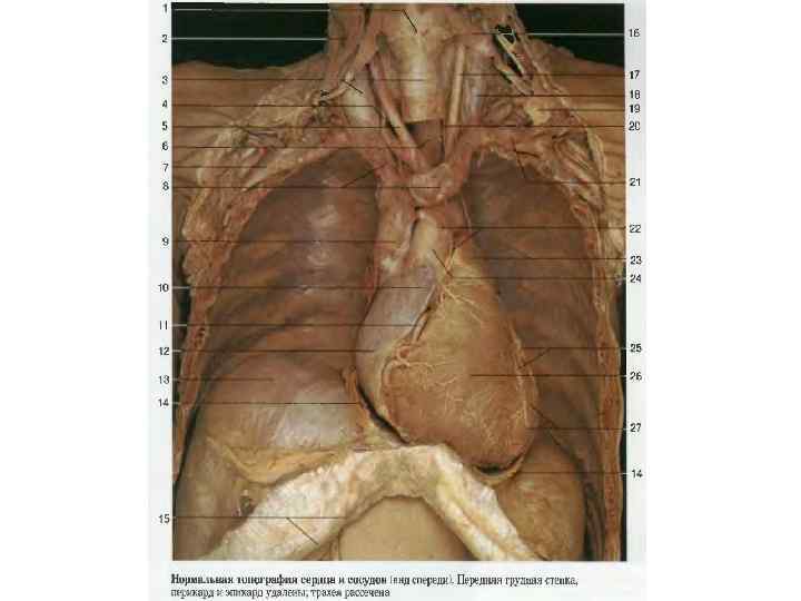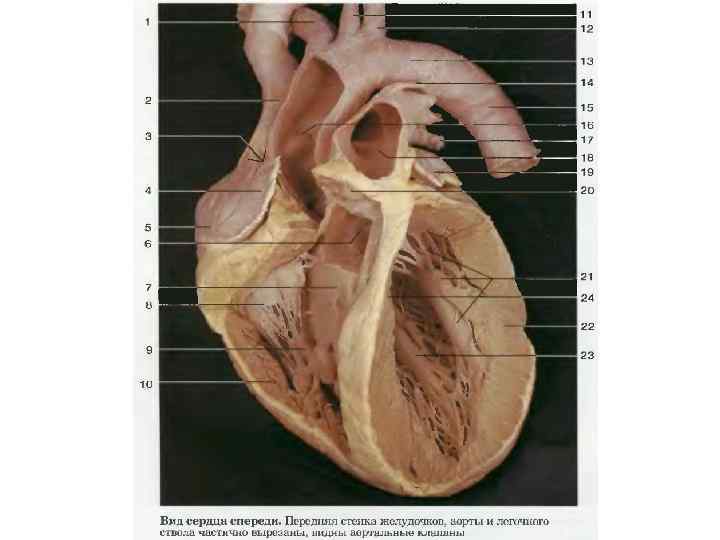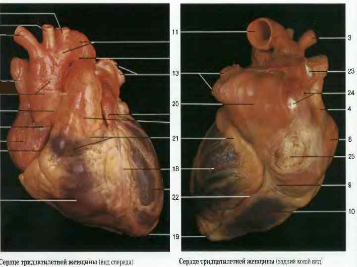 1. Права коронарна артерія 2. Ліва передня низхідна артерія 3. Ліва огинаюча артерія 4. Верхня порожниста вена 5. Нижня порожниста вена 6. АОРТА 7. Легеневий стовбур (легеневі артерії) 8. Легеневі вени
