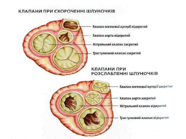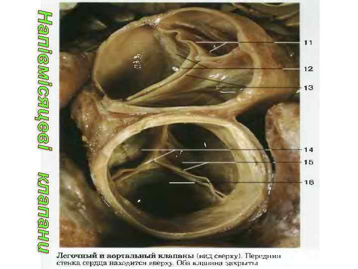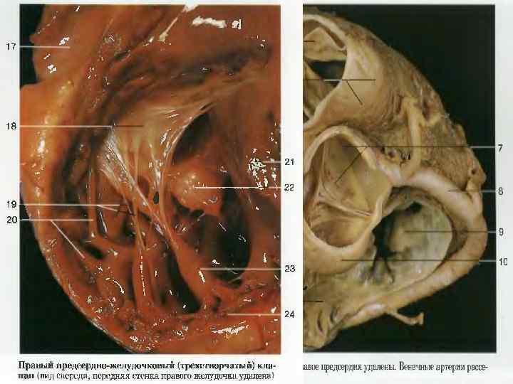 9. Праве передсердя 11. Ліве передсердя 10. Правий шлуночок 12. Лівий шлуночок 13. Трабекули 14. Хорди 15. Тристулковий клапан 16. Двостулковий клапан, або митральний 17. Півмісяцевий клапан