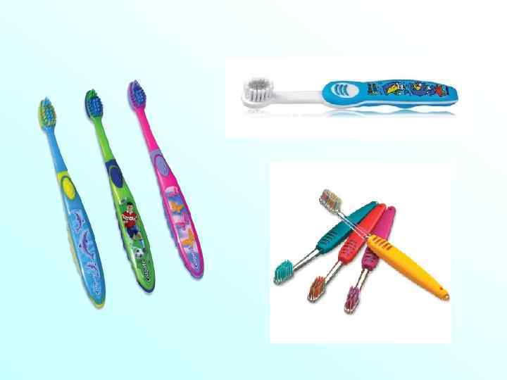 Основні вимоги до зубних щіток для дітей: • Маленька головка, що відповідає розміру зубного ряду дитини. • М’яка або дуже м’яка щетина при тимчасовому і змінному прикусі. • Велика, зручна для тримання і приваблива для дитини ручка. • Дітям віком 2 -5 років рекомендується зубна щітка, розмір робочої частини якої до 2 см, 5 -7 років — 2, 5 см, 7 -10 років— до 3 см.