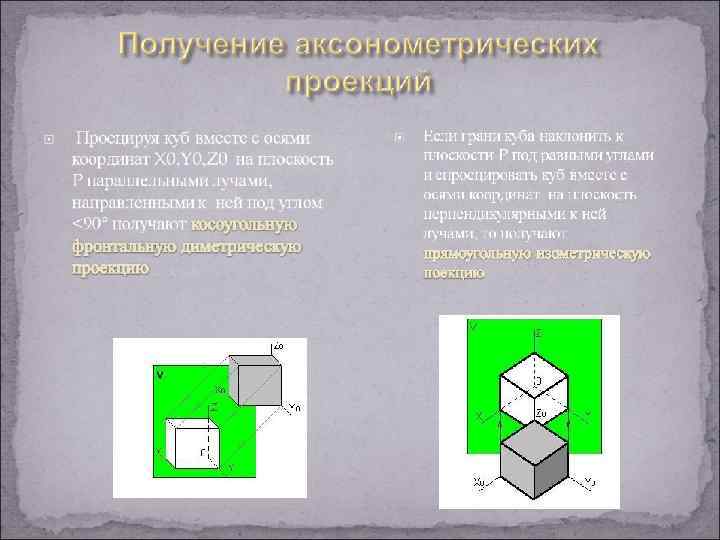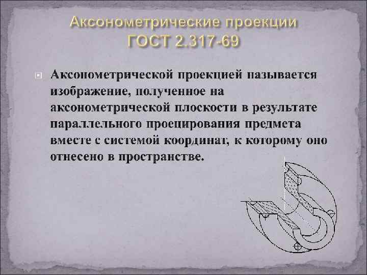 Вдоль оси x и параллельно ей откладывают натуральный размер длины предмета, вдоль y – сокращенный в два размер ширины, а вдоль z – натуральный размер ее высоты По всем аксонометрическим осям и параллельно им в изометрической проекции откладывают натуральные размеры