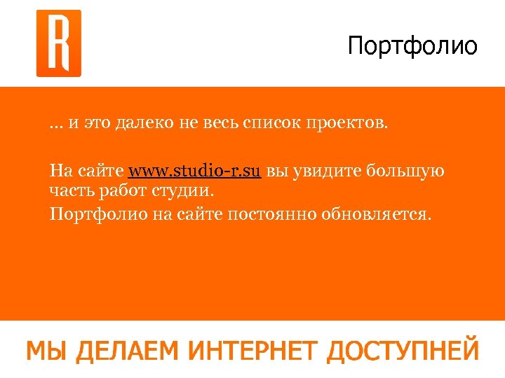 Портфолио … и это далеко не весь список проектов. На сайте www. studio-r. su вы увидите большую часть работ студии. Портфолио на сайте постоянно обновляется.