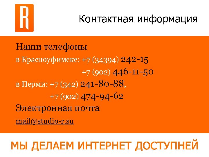 Контактная информация Наши телефоны в Красноуфимске: +7 (34394) 242 -15 +7 (902) 446 -11 -50 в Перми: +7 (342) 241 -80 -88, +7 (902) 474 -94 -62 Электронная почта mail@studio-r. su