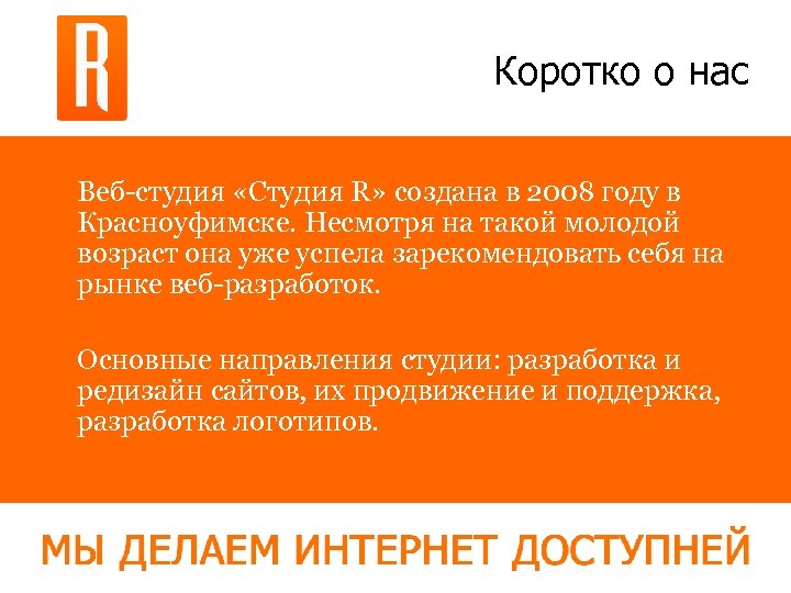 Коротко о нас Веб-студия «Студия R» создана в 2008 году в Красноуфимске. Несмотря на такой молодой возраст она уже успела зарекомендовать себя на рынке веб-разработок. Основные направления студии: разработка и редизайн сайтов, их продвижение и поддержка, разработка логотипов.