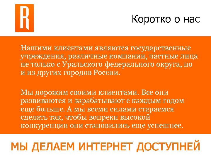 Коротко о нас Нашими клиентами являются государственные учреждения, различные компании, частные лица не только с Уральского федерального округа, но и из других городов России. Мы дорожим своими клиентами. Все они развиваются и зарабатывают с каждым годом еще больше. А мы всеми силами стараемся сделать так, чтобы вопреки высокой конкуренции они становились еще успешнее.