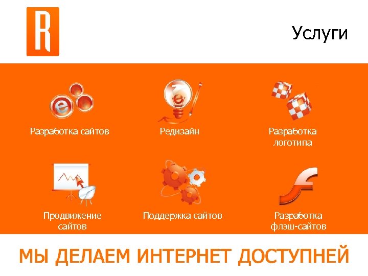Услуги Разработка сайтов Продвижение сайтов Редизайн Поддержка сайтов Разработка логотипа Разработка флэш-сайтов