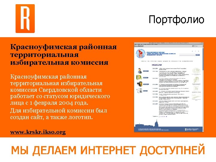 Портфолио Красноуфимская районная территориальная избирательная комиссия Свердловской области работает со статусом юридического лица с 1 февраля 2004 года. Для избирательной комиссии был создан сайт, а также логотип. www. krskr. ikso. org