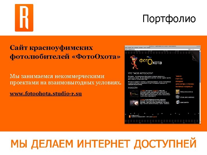 Портфолио Сайт красноуфимских фотолюбителей «Фото. Охота» Мы занимаемся некоммерческими проектами на взаимовыгодных условиях. www. fotoohota. studio-r. su