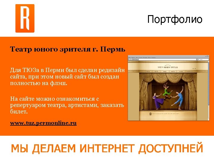 Портфолио Театр юного зрителя г. Пермь Для ТЮЗа в Перми был сделан редизайн сайта, при этом новый сайт был создан полностью на флэш. На сайте можно ознакомиться с репертуаром театра, артистами, заказать билет. www. tuz. permonline. ru