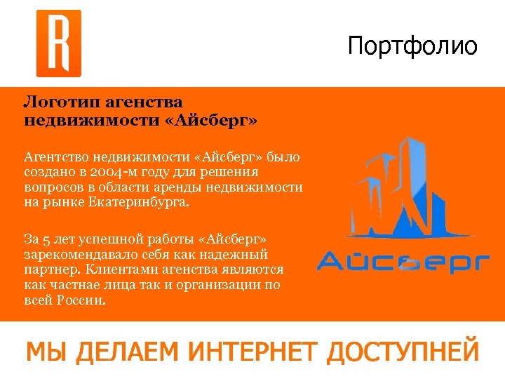 Портфолио Логотип агенства недвижимости «Айсберг» Агентство недвижимости «Айсберг» было создано в 2004 -м году для решения вопросов в области аренды недвижимости на рынке Екатеринбурга. За 5 лет успешной работы «Айсберг» зарекомендавало себя как надежный партнер. Клиентами агенства являются как частнае лица так и организации по всей России.