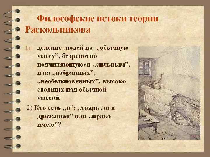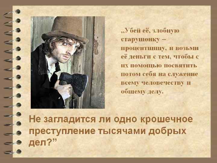 В чем смысл теории Раскольникова ? Чтобы помочь другим людям, можно использовать «простую арифметику» : убить одного ради благоденствия многих. Чтобы убить , необходимо ради своей идеи «…перешагнуть через кровь» , т. е. решить для себя важный вопрос: