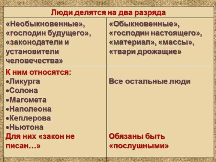Черты людей, принадлежащих к двум разрядам «Необыкновенные» «Обыкновенные» • люди консервативные, живут в послушании, любят быть послушными • обязаны быть послушными, потому что это их назначение, и тут решительно нет ничего для них унизительного • обязаны приумножать мир численно Современники не признают Не признают права их права на преступление, «необыкновенных» на однако в будущем их совершение преступления оправдывают и возводят на пьедестал • имеют право разрешить себе совершить преступление • имеют право разрушения настоящего во имя лучшего будущего • двигают мир и ведут его к цели