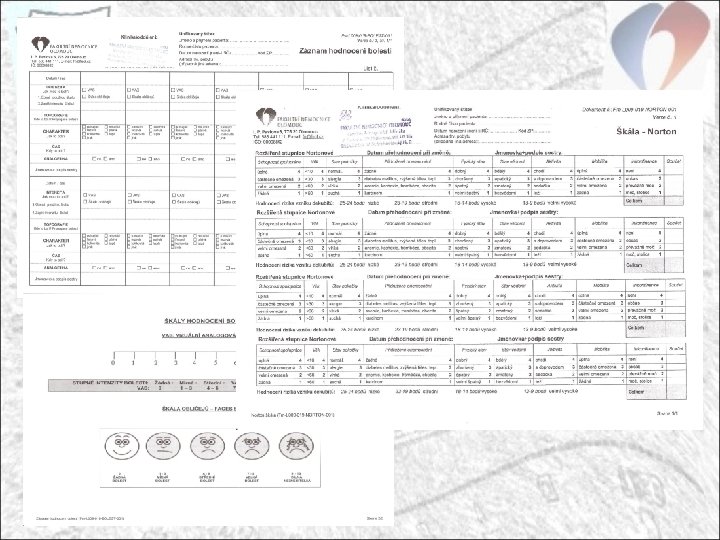 Ošetřovatelská dokumentace - příjem Součástí příjmové dokumentace je i ošetřovatelská dokumentace vztahující se k příjmu pacienta k hospitalizaci Ošetřovatelská anamnéza: zmapování potřeb pacienta dle jednotlivých komponent somatické oblasti až do oblasti psychosociální (dokumentace lišící se v závislosti na užitém konceptu ošetřovatelství), využití opět specifických skórovacích a škálovacích systémů (MMS, klasifikace dle Maddona, Nortonova škála, ADL test, nutriční dotazník, VAS – bolest. . ) - diferenciace škálovacích systémů dle druhu ošetřovací jednotky Na základě získaných informací ošetřovatelská diagnostika, stanovení ošetřovatelských diagnóz – specifikace ošetřovatelských problémů a) stanovení cílů, konkrétních, krátkodobých, středně a dlouhodobých b) stanovení intervencí vedoucích ke splnění cílů c) pravidelné hodnocení dosáhnutí cíle nebo respecifikace problému (v průběhu hospitalizace v závislosti na vývoji potřeb pacienta)